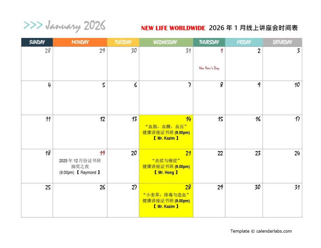 2026年1月份健康讲座证书班报名表格: https://www.newlifeworldwide.asia/regtalk
